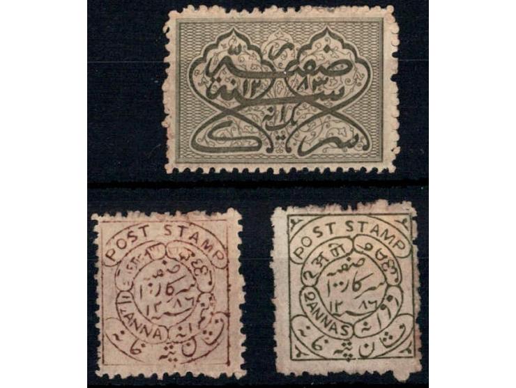 1869 1 anna olive-green & 1870 ½ and 2 annas, complete set of the 1st issue of Hyderabad