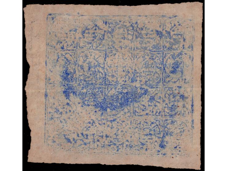 1867-77 ½a ultramarine in watercolor on native paper, complete sheet of 20. Complete sheets of the Kashmir 'Old Rectuangulars' are extremely rare. Unused without gum as issued. Catalog value as single stamps alone is £300. 2025 ISES certificate