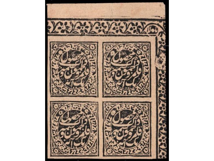 1887-94 1a black on thin creamy laid paper, corner marginal block of four. Unused without gum as issued.