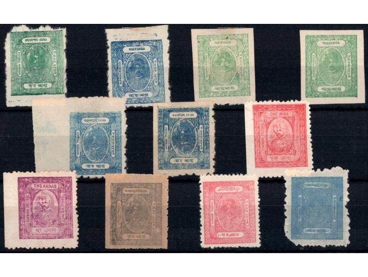 Group of mint stamps - 1921 ¼ anna green and ½ anna ultramarine on soft wove paper, ½ anna green on laid batonne paper, 1922- ¼ anna deep-grey blue and steel-blue, 1 anna vermillion and 2 anna purple, ¼ anna grey-blue, 1923 ¼ anna rose, 1925 ¼ anna milky-blue on laid paper. Unused without gum as issued