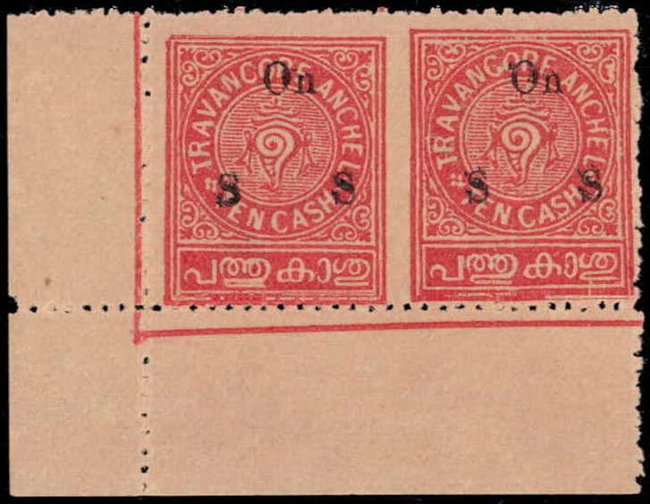 1930-39 10ca bottom left corner marginal horizontal pair with error, imperf between. Unused without gum as issued