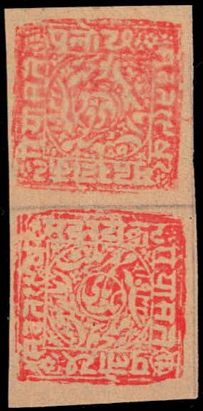 1885-94 1a red on yellow-green laid paper vertical marginal pair. This stamp is listed in the ½a denomination only as SG 48. Unused without gum as issued.