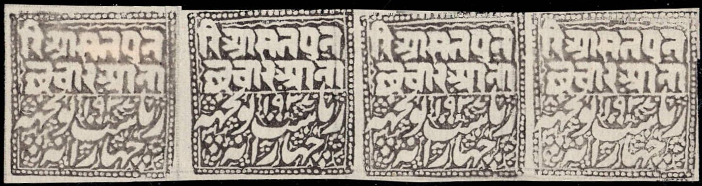 1887 4a black on toned wove batonne paper, horizontal strip of 4. Unused without gum as issued. Catalog value as singles is £88, multiples of the 4a denomination are scarce.