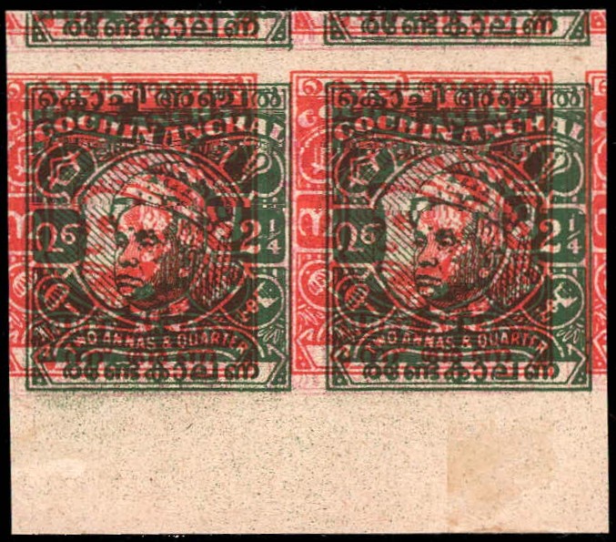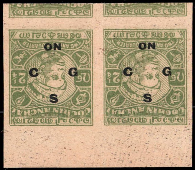 1948-49 2¼a yellow-green horizontal marginal pair, Printers waste with ON C G S overprint inverted. The 2¼a stamp is also printed on the reverse but in the color of the 4p with an additional impression of the 3p stamp in carmine. A spectacular item.