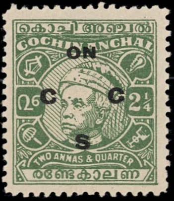 1948-49 2¼a yellow-green Printers waste with ON C G S overprint inverted. The 2¼a stamp is also printed on the reverse but in the color of the 4p with an additional impression of the 3p stamp in carmine.