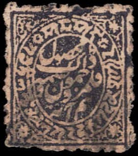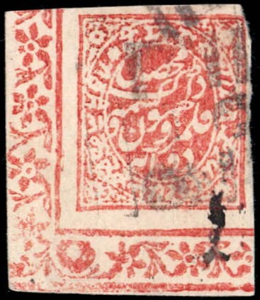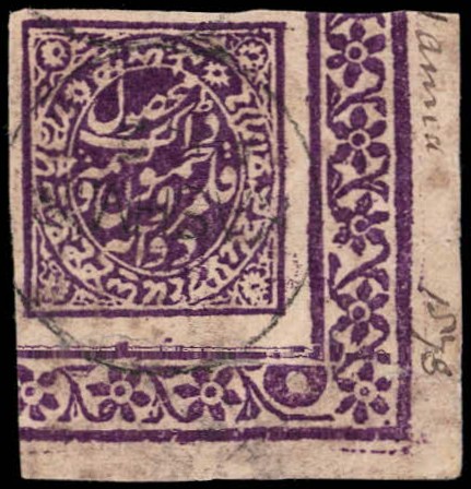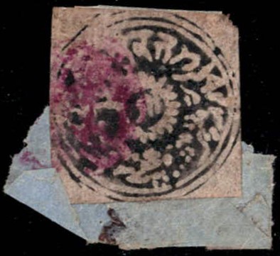 1866 ½a grey-black in watercolor on native paper cancelled by Jammu magenta seal cancel on small fragment.