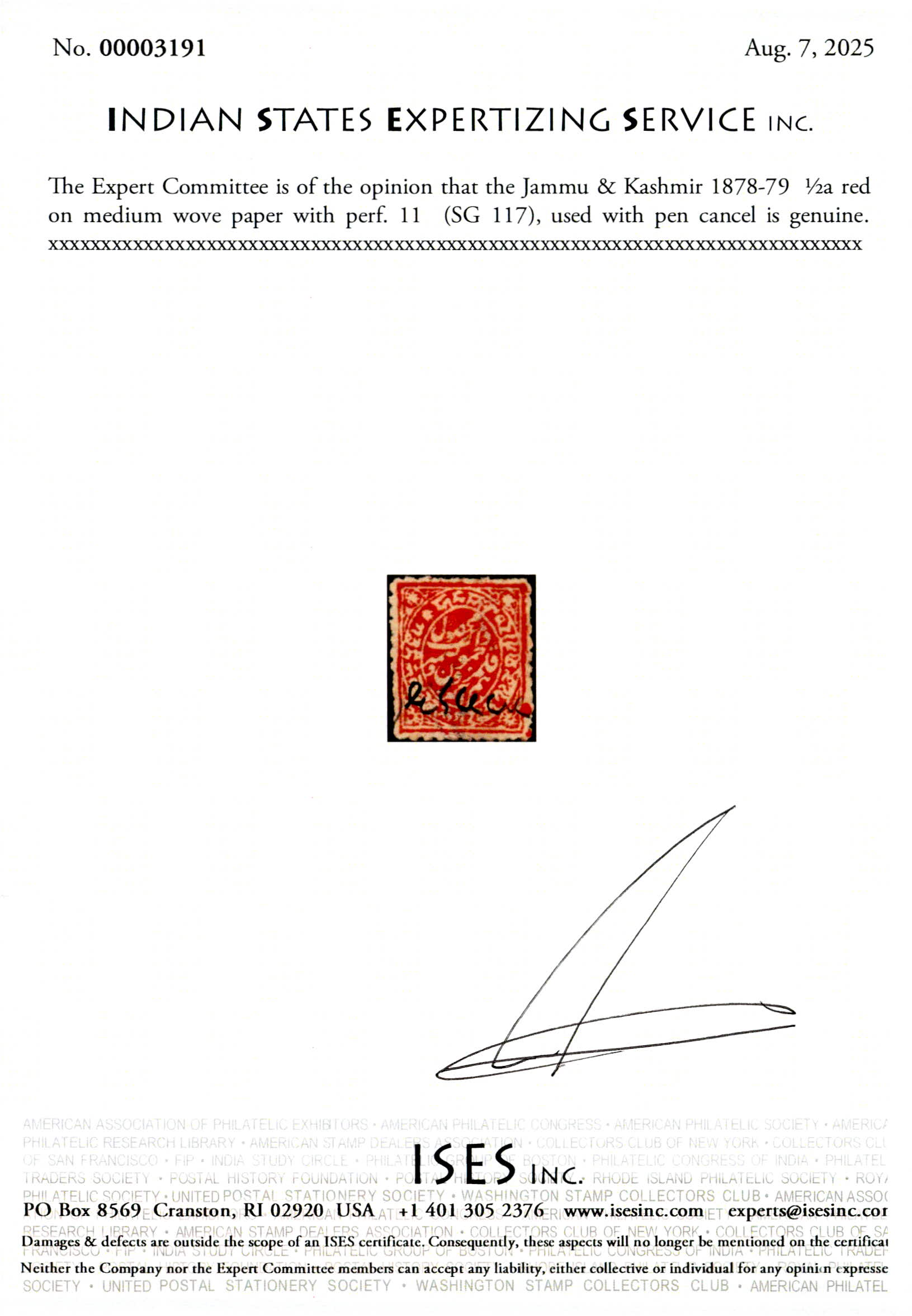 1878-79 ½a red on medium wove paper with perf. 11 with pen cancel as sometimes found. 2025 ISES certificate.
