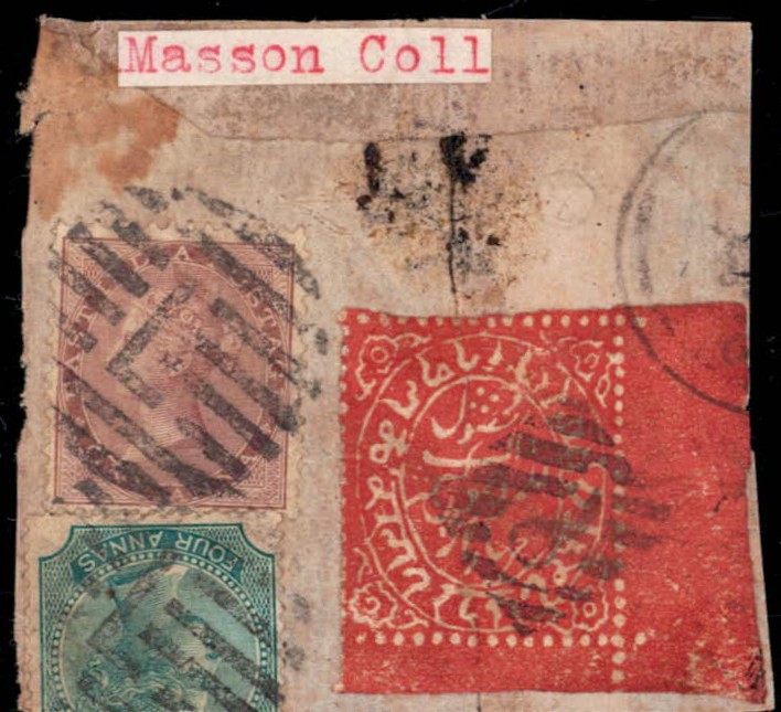 1879 4a red on thin wove paper used on piece with India stamps. Ex Masson collection