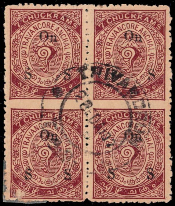 1930-39 7ch block of four overprinted On S S with error, imperf between vertical pair x 2. bottom left stamp with corner defect.