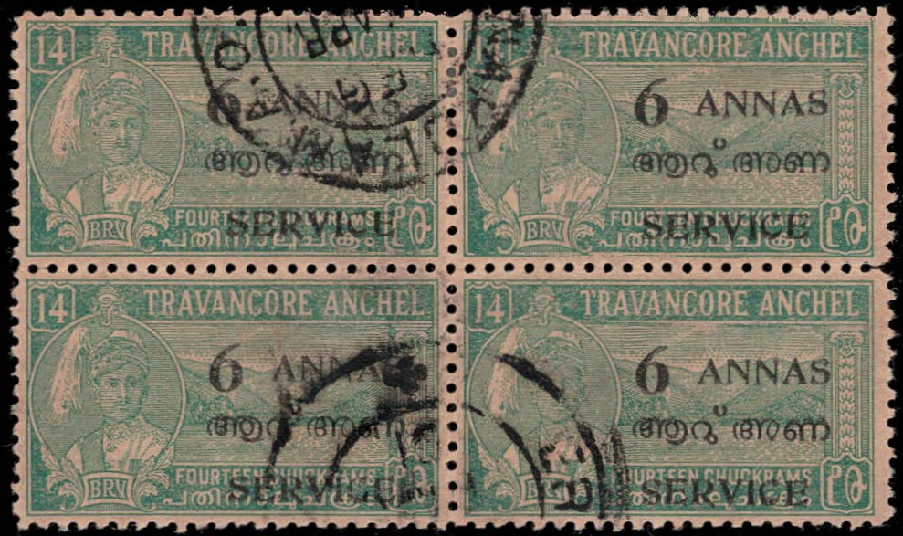 1949 14ch surcharged 6 ANNAS overprinted SERVICE perf. 11 block of 4