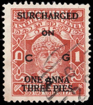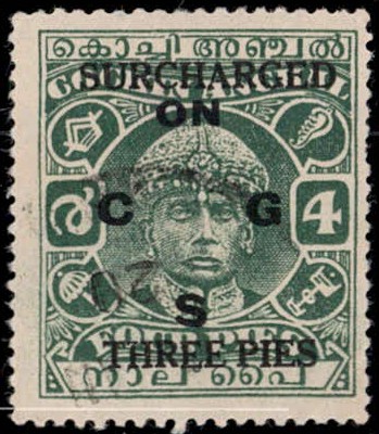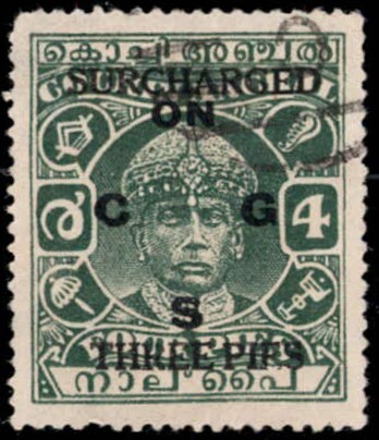 1942-43 4p green overprinted ON C G S surcharged "SURCHARGED / THREE PIES"